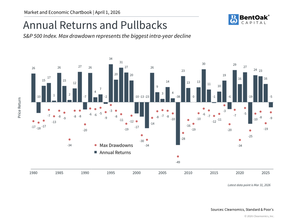 First, equity markets have been choppy to start 2025, with the S&P 500 pulling back from the all-time highs reached earlier in the year. While this can feel unsettling, drawdowns of this magnitude are a routine feature of functioning markets. In any given year, the average intra-year decline is -13.5%, yet most years end in positive territory, with markets averaging approximately 9% annual gains over time. Last year was a good example where the S&P 500 weathered six pullbacks driven largely by tariff and policy uncertainty, yet still delivered an almost 18% total return for the year.2 Investors who remain disciplined through short-term volatility have historically been better positioned to capture long-term returns.