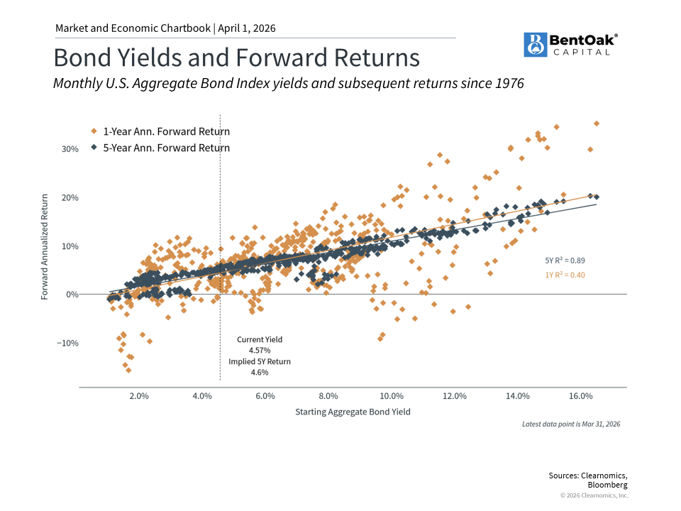 Some perspective is helpful here. Following the historic bond market selloff in 2022, when inflation and interest rates rose sharply, bonds staged a meaningful recovery and generated strong returns from 2023 through 2025. Since bottoming out in October 2022, the broad bond market [Bloomberg Aggregate Bond Index] has delivered approximately 20% in total returns through March 2026 (total return includes price change plus reinvested income), with certain sectors [Bloomberg  High Yield Very Liquid Index] performing even better.